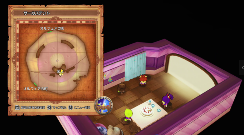 ▲欧鲁非亚镇 --> 回到欧鲁非亚镇,进入马戏团后台“楽屋”,触发剧情。 --> 剧情后团长请求玩家前往ミュルエルの森当中的フォステイル広場,一起击败恶魔。出发前建议整顿一下装备。 |