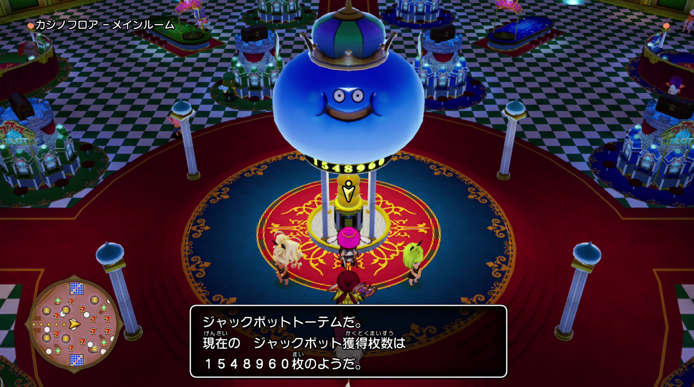 Jack Pot,即大满贯,也叫做特殊奖励。调查赌场正中央的史莱姆王可以查看中奖后将会获得的代币数量,这个数量会随着玩家进行赌场游戏逐渐增多。中奖的条件是:游玩“老虎机”游戏时,在“金属”状态下,摇出五个“7”。概率可以说是非常低,可遇而不可求,不用专门去刷,但如果挂机刷老虎机的时候中了,那就发大财。