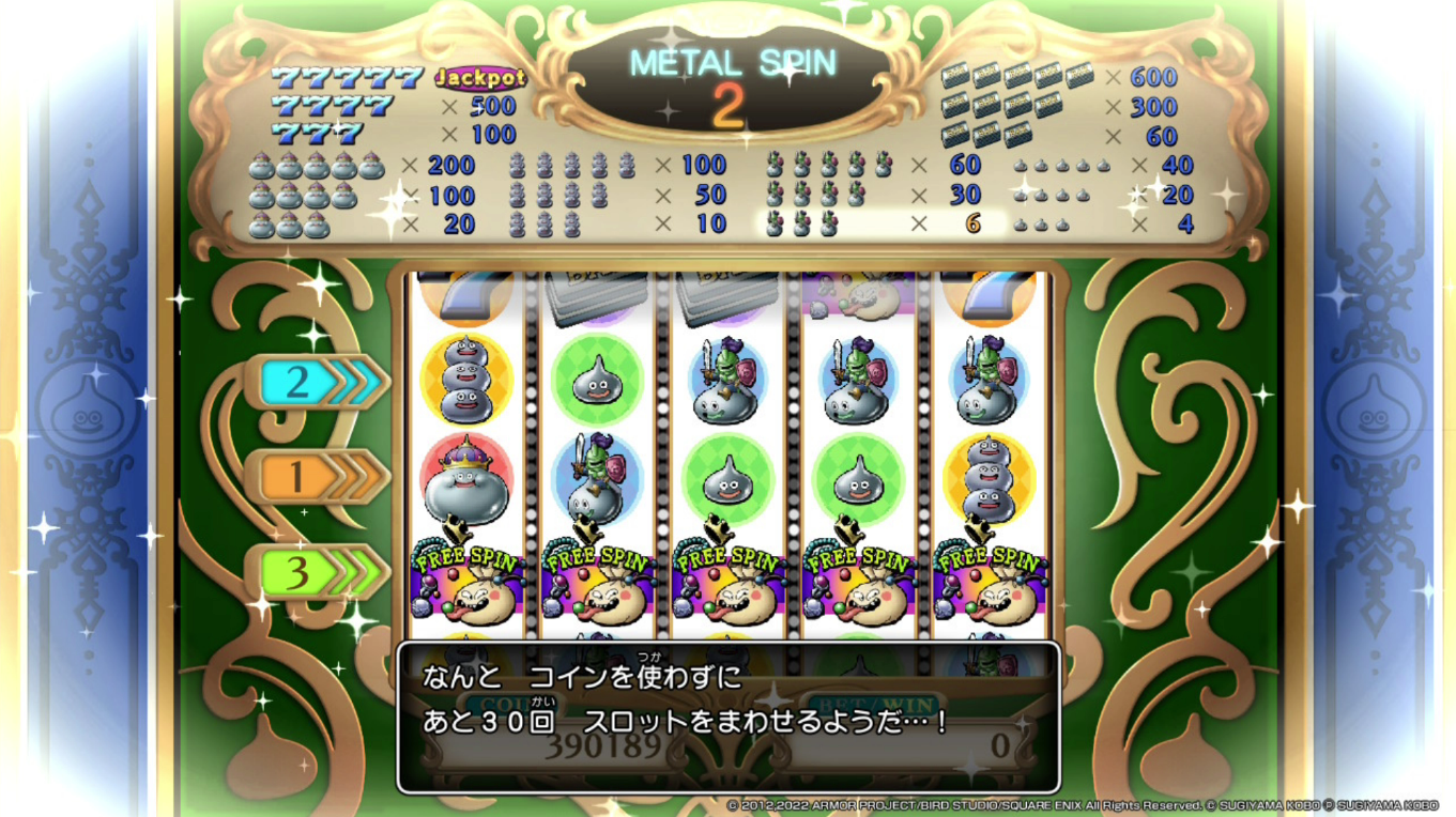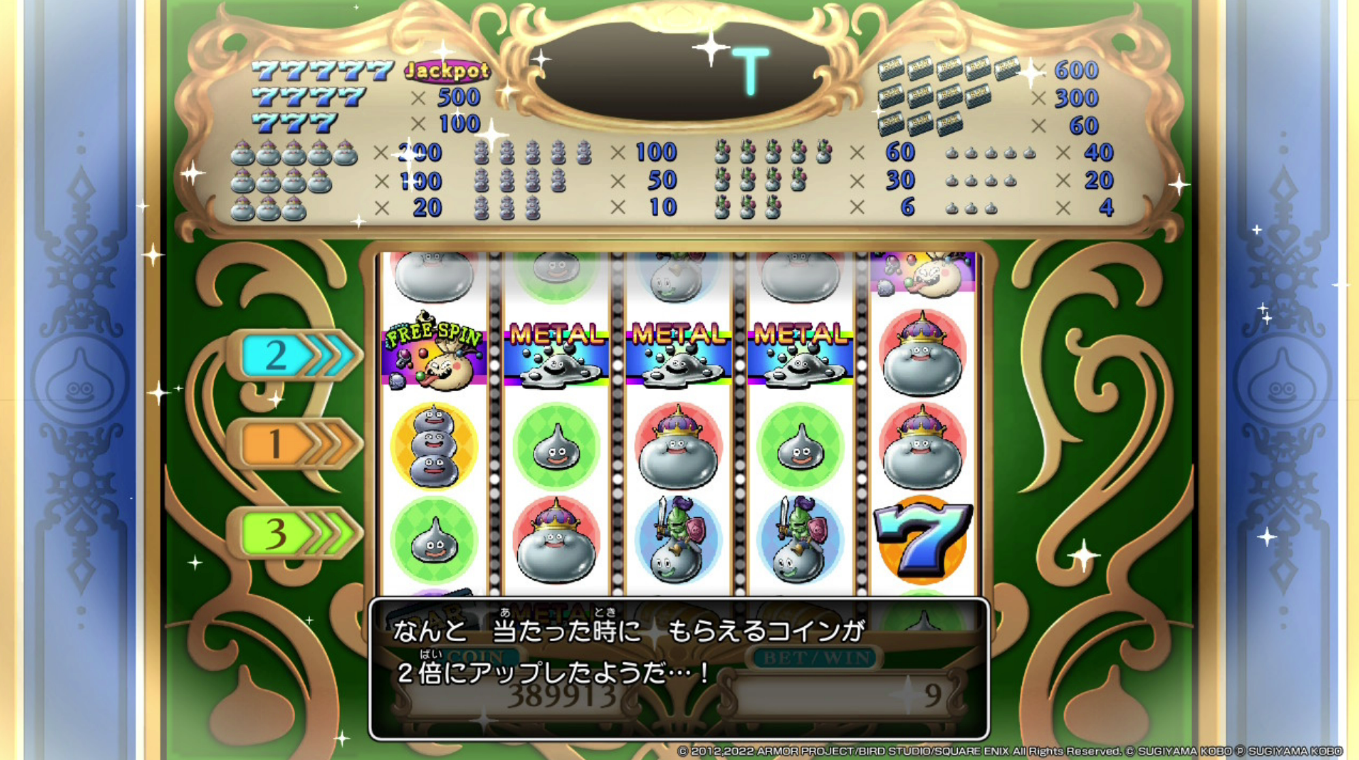 (1)“金属”状态。当老虎机停下时,如果命中连续3只以上的失散金属史莱姆,则进入“金属”状态。如果命中连续3只,则该状态持续10回合;命中连续4只,持续20回合;命中连续5只,持续30回合。在“金属”状态下,获得的代币奖励变成2倍。