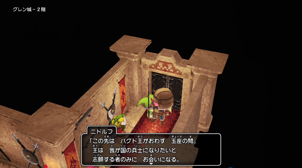 ▲抵达古莲城区(グレン城下町) --> 首次抵达古莲城区(グレン城下町),城堡门口大阶梯处的ゴード告诉玩家,可以去找国王成为城堡的志愿兵。 --> 进入城堡,跟2楼王座之间门口的守卫二ドルフ对话,进入王座之间触发剧情。 --> 进入城镇的宿屋,触发剧情。贤者エイドス临时加入队伍。 ![]() 跟城堡2楼门口士兵对话进入王座之间 ![]() 贤者エイドス |