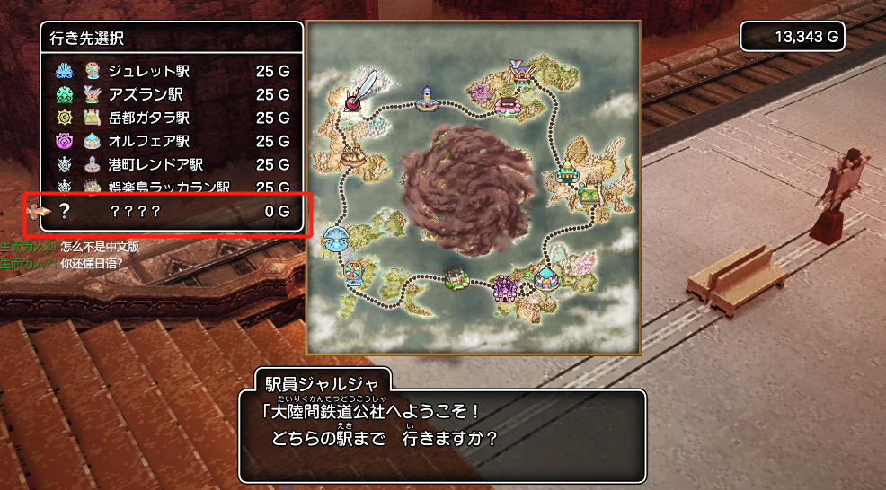 ▲过去的古莲城 (注意:要前往过去世界,必须以人类的姿态返回,且会暂时跟同伴分别。) --> 去车站跟工作人员对话,发生剧情。 --> 再次跟车站工作人员对话,选择最后一项“????”,发生剧情,进入过去的世界。(想回原来的世界的话,再次跟车站人员对话即可) --> 在过去的古莲城的大台阶处触发剧情。 --> 进入古莲城堡,在2楼的王座之间触发剧情。 --> 前往莲城堡1层的艾鲁玖的房间(エルジュの部屋),触发剧情。 ![]() 乘坐火车选择“????”前往过去世界 ![]() 过去世界エルジュ的房间  |