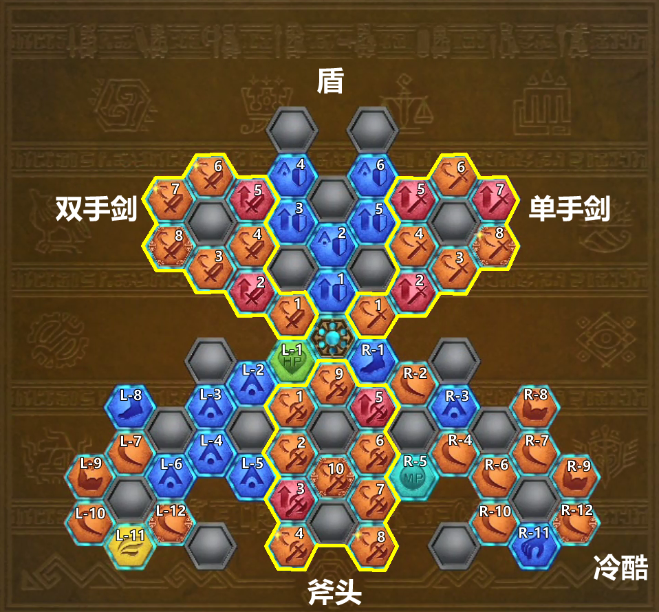 修萨(ヒューザ)的技能板共有5个板块:单手剑(右上),双手剑(左上),斧(下),盾(上)和帅气(右下和左下)。其中,“帅气”技能板是修萨的专属技能板。【注:下文中对特技的推荐程度为笔者的主观判断,仅供参考】